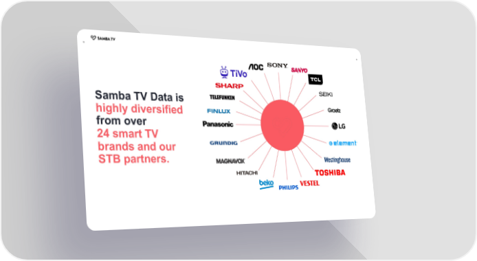 + + Samba TV Data is highly diversified from over 24 smart TV brands and our STB partners.
