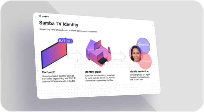 + + Samba TV Identity Connecting first-party audiences to inform planning and optimization ContentID Identity graph Identity resolution Unique persistent identifier sourced Associate devices within a household Connecting linear and digital from video fingerprinting and Wi-Fi IP by using cookies, device IDs, MAIDS impressions across devices rd party data address & Cable networks in the US matched to our persistent identifier with 3