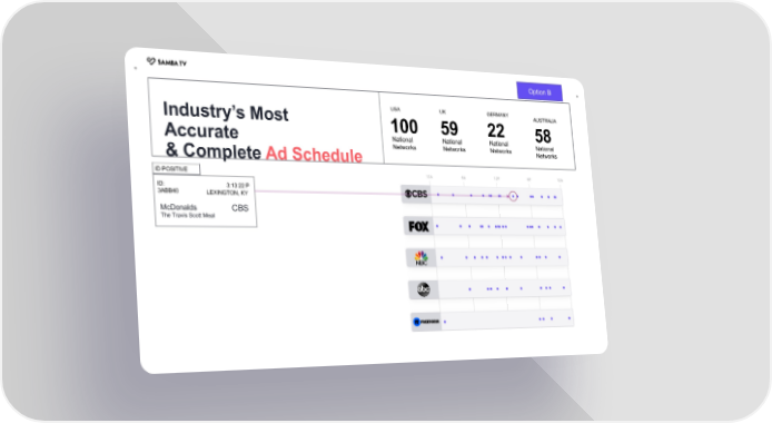+ Option B + Industry’s Most USA UK GERMANY AUSTRALIA 100 59 22 58 Accurate National National National National & Complete Ad Schedule Networks Networks Networks Networks ID POSITIVE ID: 3:13:22 P 3ABB40 LEXINGTON, KY McDonalds CBS The Travis Scott Meal