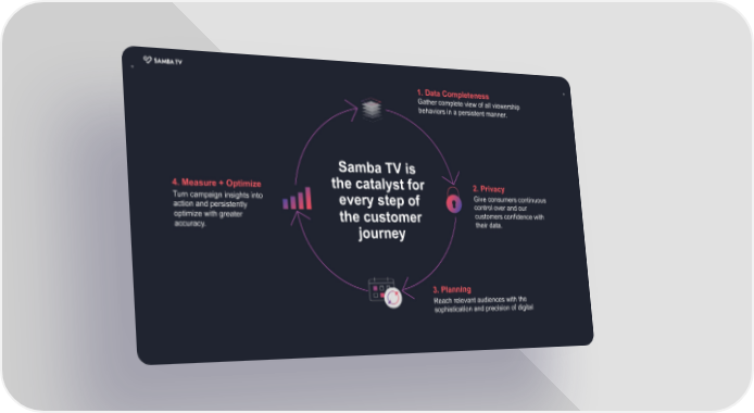 + 1. Data Completeness + Gather complete view of all viewership behaviors in a persistent manner. Samba TV is 4. Measure + Optimize the catalyst for 2. Privacy Turn campaign insights into every step of Give consumers continuous action and persistently control over and our optimize with greater the customer customers confidence with accuracy. journey their data. 3. Planning Reach relevant audiences with the sophistication and precision of digital