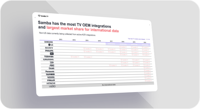 + + Samba has the most TV OEM integrations and largest market share for international data Non-US data currently being collected from active ACR integrations Year that TV models were released 2013 2014 2015 2016 2017 2018 2019 2020 * No international data No international data