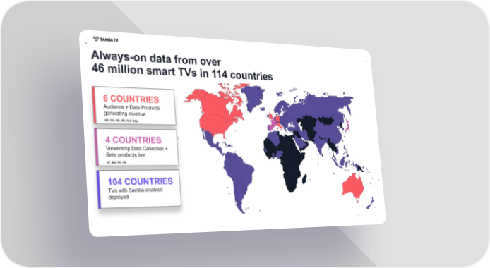 + + Always-on data from over 46 million smart TVs in 114 countries 6 COUNTRIES Audience + Data Products generating revenue US, CA, UK, DE, AU, Italy 4 COUNTRIES Viewership Data Collection + Beta products live JP, ES, FR, DE 104 COUNTRIES TVs with Samba enabled deployed