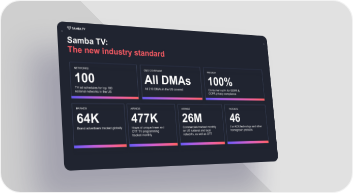 + + Samba TV: The new industry standard NETWORKS GEO COVERAGE PRIVACY 100 All DMAs 100% TV ad schedules for top 100 All 210 DMAs in the US covered Consumer opt-in for GDPR & national networks in the US CCPA privacy compliance BRANDS AIRINGS AIRINGS PATENTS 64K 477K 26M 46 Brand advertisers tracked globally Hours of unique linear and Commercials tracked monthly For ACR technology and other OTT TV programming on US national and local homegrown products tracked monthly networks, as well as OTT