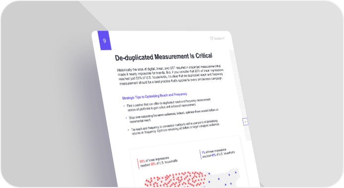 9 De-duplicated Measurement Is Critical 03 04 Historically the silos of digital, linear, and OTT resulted in disjointed measurement that made it nearly impossible for brands. But, if you consider that 93% of linear impressions 05 reached just 55% of U.S. households, it’s clear that de-duplicated reach and frequency measurement should be a best practice that’s applied to every omniscreen campaign. 06 07 Strategic Tips to Optimizing Reach and Frequency 08 • Find a partner that can offer de-duplicated reach and frequency measurement 09 across all platforms to gain a true and unbiased measurement. • Stop over-saturating the same audiences; instead, optimize those wasted dollars on 10 incremental reach. 11 • Tie reach and frequency to conversion metrics to define your point of diminishing returns on frequency. Optimize remaining ad dollars to target untapped audiences. 12 13 14 93% of linear impressions 7% of linear impressions reached 55% of U.S. households reached 45% of U.S. households