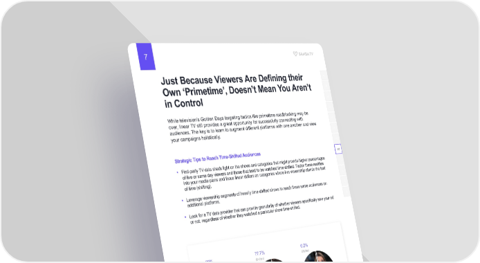 7 Just Because Viewers Are Defining their 03 Own ‘Primetime’, Doesn’t Mean You Aren’t 04 in Control 05 06 While television’s Golden Days targeting tactics like primetime roadblocking may be over, linear TV still provides a great opportunity for successfully connecting with 07 audiences. The key is to learn to augment different platforms with one another and view your campaigns holistically. 08 09 Strategic Tips to Reach Time-Shifted Audiences 10 • First-party TV data sheds light on the shows and categories that might provide higher percentages of live or same day viewers and those that tend to be watched time-shifted. Factor these realities 11 into your media plans and focus linear dollars on categories where live viewership stands the test of time (shifting). 12 • Leverage viewership segments of heavily time-shifted shows to reach these same audiences on 13 additional platforms. • Look for a TV data provider that can provide granularity of whether viewers specifically saw your ad 14 or not, regardless of whether they watched a particular show time-shifted. 69% 77.7% 0.2% Shifted Shifted Shifted 31% 23.3% 99.8% Live Live Live White Lotus Last Week Tonight The Today Show