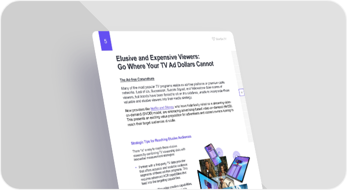 5 Elusive and Expensive Viewers: 03 Go Where Your TV Ad Dollars Cannot 04 05 The Ad-free Conundrum 06 Many of the most popular TV programs reside on ad-free platforms or premium cable networks. Last of Us, Succession, Suicide Squad, and Yellowstone draw scores of 07 viewers, but brands have been forced to sit on the sidelines, unable to incorporate these valuable and elusive viewers into their media strategy. 08 Now providers like Netflix and Disney, who have historically relied on a streaming video- 09 on-demand (SVOD) model, are embracing advertising-based video-on-demand (AVOD). This presents an exciting value proposition for advertisers and content owners looking to 10 reach their target audiences at scale. 11 12 Strategic Tips for Reaching Elusive Audiences 13 There *is* a way to reach these elusive 14 viewers by combining TV viewership data with innovative measurement strategies: • Partner with a first-party TV data provider that offers accurate and scalable audience segments of these ad-free programs. This requires advanced ACR capabilities that feed into the targeting capabilities. • Leverage cutting-edge creative capabilities, rather than simply recycling linear ads. • Redirect TV ad budgets toward digital media, premium OTT publishers, and even the walled gardens of social media to engage these elusive audiences. This also allows brands to reach cord-cutters on addressable digital devices through proven data-driven tactics. • For those committed to linear TV strategies, utilize custom audience discovery insights to determine what additional programs elusive audiences are watching and reallocate ad dollars to digital tactics powered by TV data.