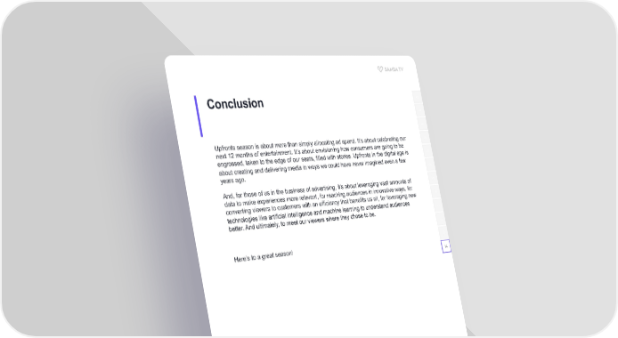 Conclusion 03 04 05 Upfronts season is about more than simply allocating ad spend. It’s about celebrating our 06 next 12 months of entertainment. It’s about envisioning how consumers are going to be engrossed, taken to the edge of our seats, filled with stories. Upfronts in the digital age is 07 about creating and delivering media in ways we could have never imagined even a few years ago. 08 And, for those of us in the business of advertising, it’s about leveraging vast amounts of 09 data to make experiences more relevant, for reaching audiences in innovative ways, for converting viewers to customers with an efficiency that benefits us all, for leveraging new 10 technologies like artificial intelligence and machine learning to understand audiences better. And ultimately, to meet our viewers where they chose to be. 11 12 Here’s to a great season! 13 14